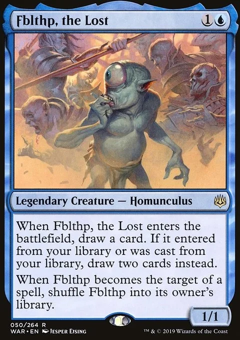 When Fblthp, the Lost enters the battlefield, draw a card. If it entered from your library or was cast from your library, draw two cards instead. When Fblthp becomes the target of a spell, shuffle Fblthp into its owner's library.