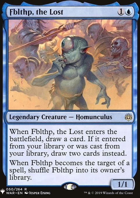 When Fblthp enters, draw a card. If it entered from your library or was cast from your library, draw two cards instead. When Fblthp becomes the target of a spell, shuffle Fblthp into its owner's library.