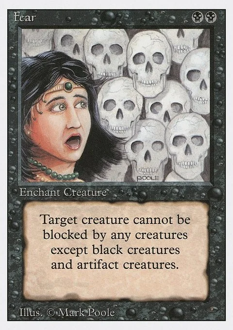 Enchant creature (Target a creature as you cast this. This card enters the battlefield attached to that creature.) Enchanted creature has fear. (It can't be blocked except by artifact creatures and/or black creatures.)