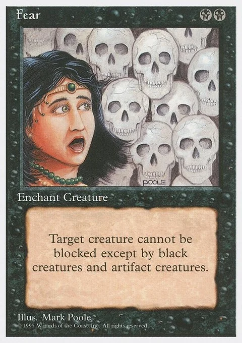 Enchant creature (Target a creature as you cast this. This card enters the battlefield attached to that creature.) Enchanted creature has fear. (It can't be blocked except by artifact creatures and/or black creatures.)