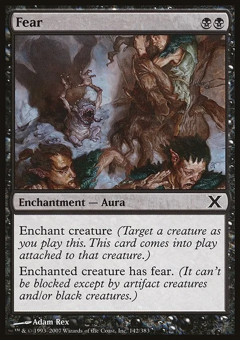 Enchant creature (Target a creature as you cast this. This card enters attached to that creature.) Enchanted creature has fear. (It can't be blocked except by artifact creatures and/or black creatures.)