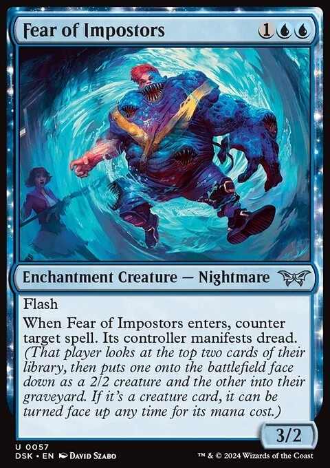 When Fear of Impostors enters, counter target spell. Its controller manifests dread. (That player looks at the top two cards of their library, then puts one onto the battlefield face down as a 2/2 creature and the other into their graveyard. If it's a creature card, it can be turned face up any time for its mana cost.)