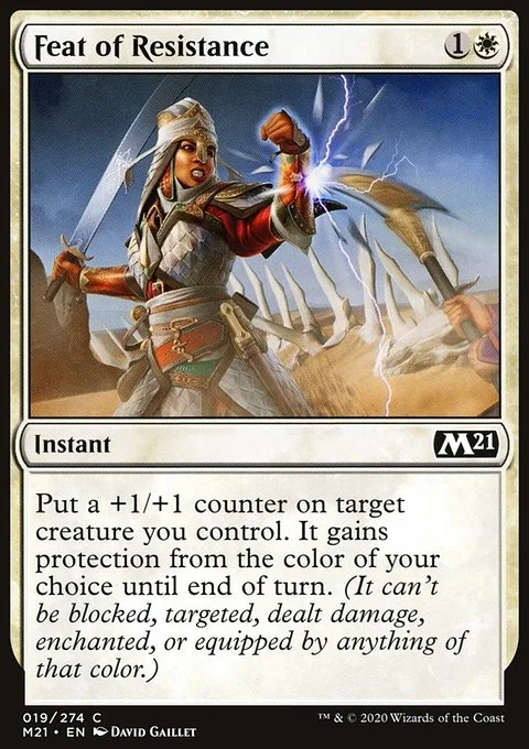 Put a +1/+1 counter on target creature you control. It gains protection from the color of your choice until end of turn. (It can't be blocked, targeted, dealt damage, enchanted, or equipped by anything of that color.)