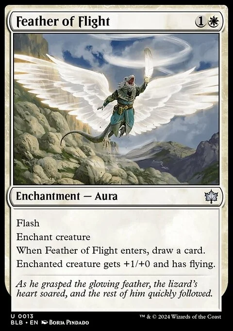 Flash Enchant creature When Feather of Flight enters, draw a card. Enchanted creature gets +1/+0 and has flying.
