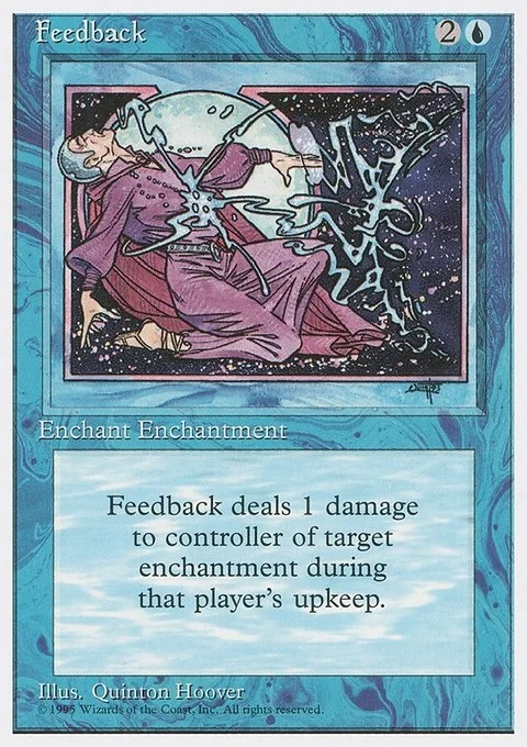Feedback deals 1 damage to controller of target enchantment during that player’s upkeep.