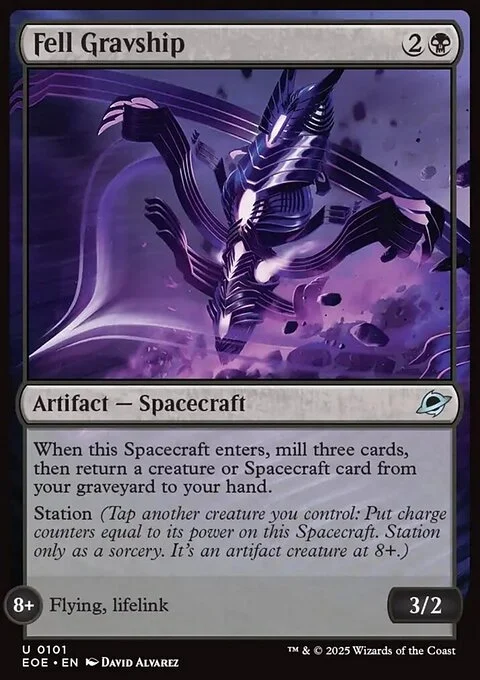 When this Spacecraft enters, mill three cards, then return a creature or Spacecraft card from your graveyard to your hand.