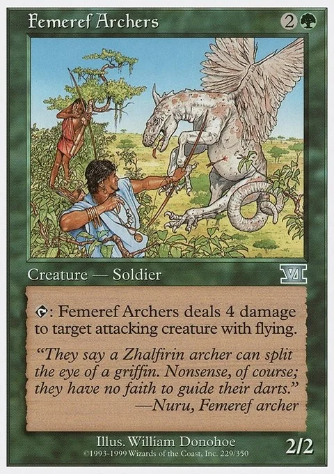 T: Femeref Archers deals 4 damage to target attacking creature with flying.