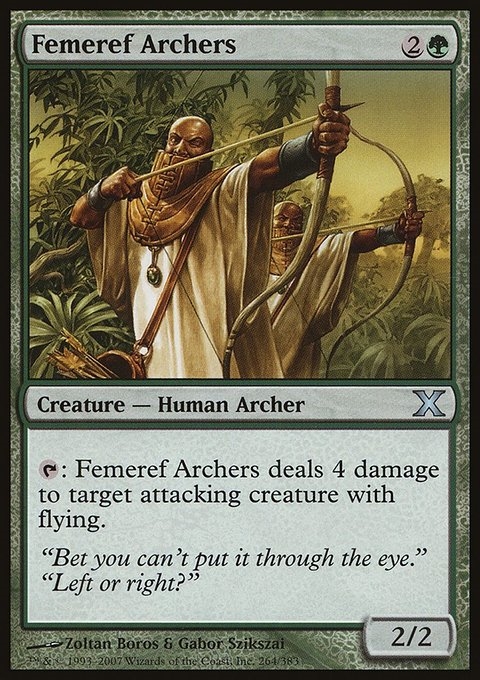 {T}: Femeref Archers deals 4 damage to target attacking creature with flying.