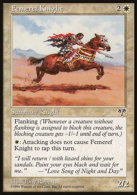 Flanking (Whenever a creature without flanking blocks this creature, the blocking creature gets -1/-1 until end of turn.) {W}: Femeref Knight gains vigilance until end of turn.