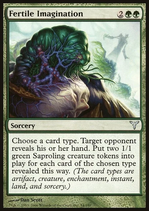 Choose a card type. Target opponent reveals their hand. Create two 1/1 green Saproling creature tokens for each card of the chosen type revealed this way. (Artifact, creature, enchantment, instant, land, planeswalker, sorcery, and tribal are card types.)