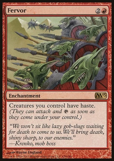 Creatures you control have haste. (They can attack and {T} as soon as they come under your control.)