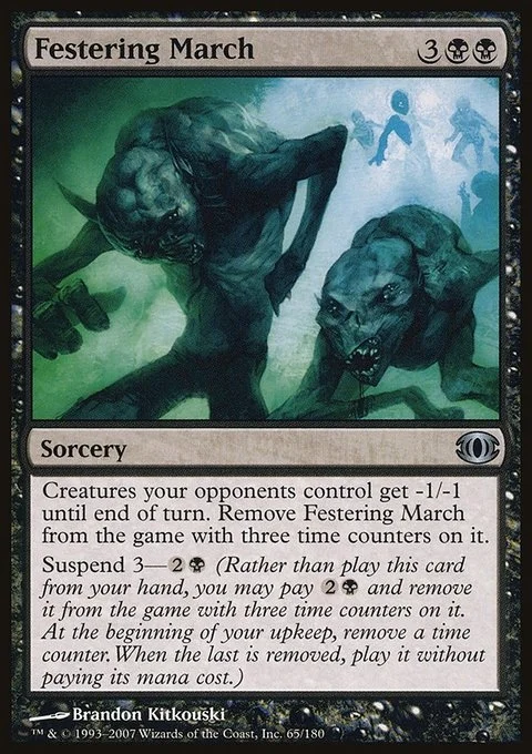 Creatures your opponents control get -1/-1 until end of turn. Remove Festering March from the game with three time counters on it.