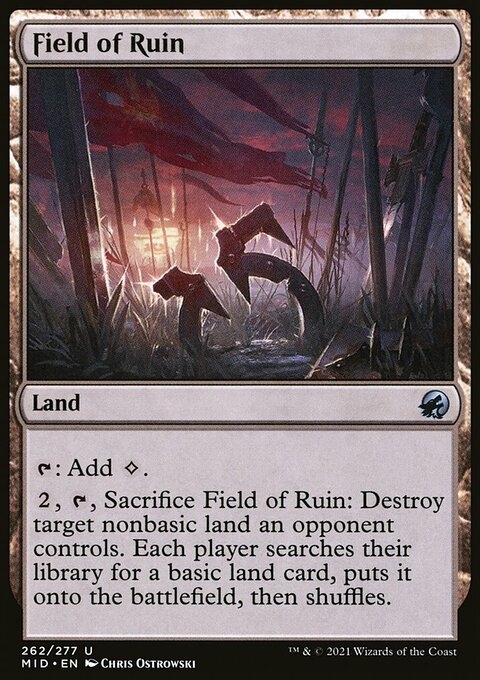 {T}: Add {C}. {2}, {T}, Sacrifice Field of Ruin: Destroy target nonbasic land an opponent controls. Each player searches their library for a basic land card, puts it onto the battlefield, then shuffles.