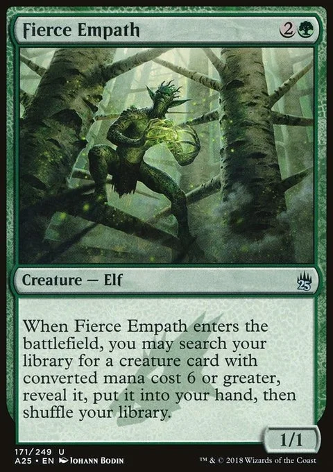 When Fierce Empath enters the battlefield, you may search your library for a creature card with mana value 6 or greater, reveal it, put it into your hand, then shuffle.