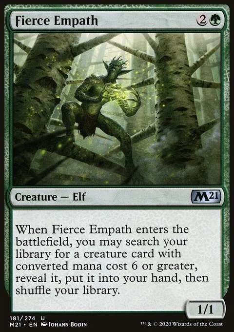 When Fierce Empath enters the battlefield, you may search your library for a creature card with mana value 6 or greater, reveal it, put it into your hand, then shuffle.