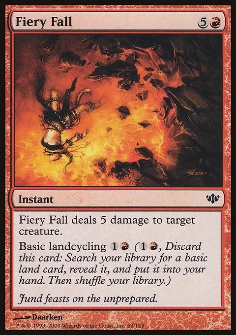 Fiery Fall deals 5 damage to target creature. Basic landcycling {1}{R} ({1}{R}, Discard this card: Search your library for a basic land card, reveal it, put it into your hand, then shuffle.)