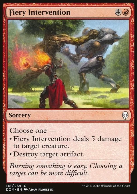 Choose one — • Fiery Intervention deals 5 damage to target creature. • Destroy target artifact.