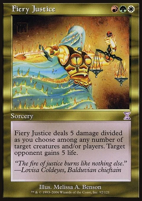 Fiery Justice deals 5 damage divided as you choose among any number of targets. Target opponent gains 5 life.