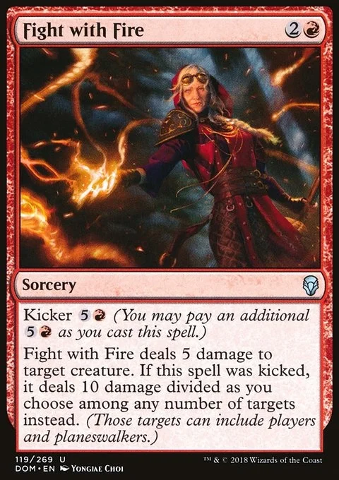 Kicker {5}{R} (You may pay an additional {5}{R} as you cast this spell.) Fight with Fire deals 5 damage to target creature. If this spell was kicked, it deals 10 damage divided as you choose among any number of targets instead. (Those targets can include players and planeswalkers.)