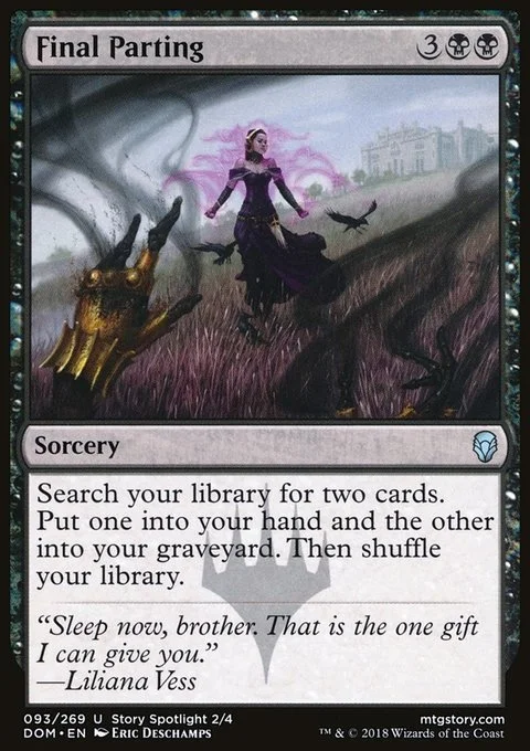 Search your library for two cards. Put one into your hand and the other into your graveyard. Then shuffle.