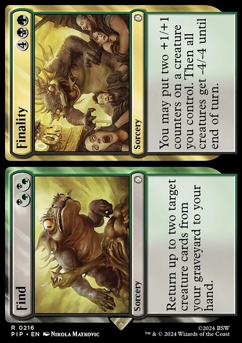 Find Return up to two target creature cards from your graveyard to your hand. Finality You may put two +1/+1 counters on a creature you control. Then all creatures get -4/-4 until end of turn.