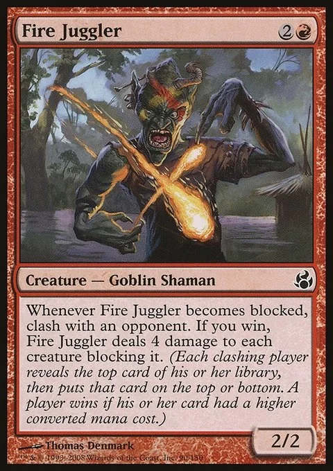 Whenever Fire Juggler becomes blocked, clash with an opponent. If you win, Fire Juggler deals 4 damage to each creature blocking it. (Each clashing player reveals the top card of their library, then puts that card on the top or bottom. A player wins if their card had a higher mana value.)