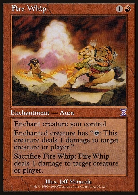 Enchant creature you control Enchanted creature has "{T}: This creature deals 1 damage to any target." Sacrifice Fire Whip: Fire Whip deals 1 damage to any target.