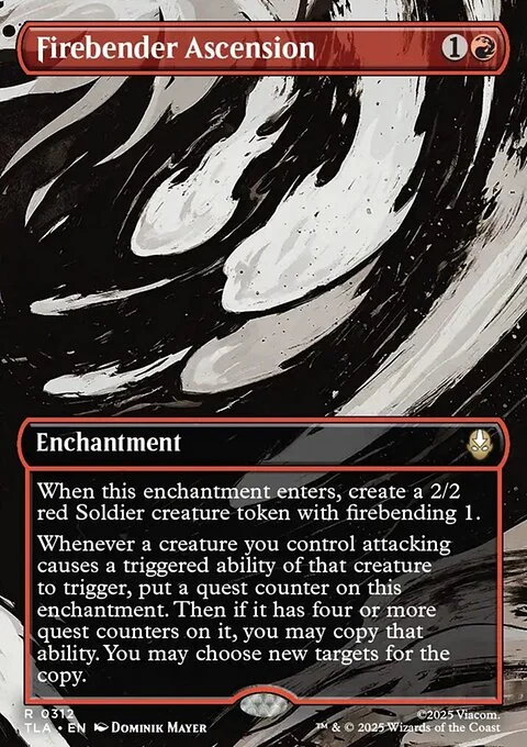 Whenever a creature you control attacking causes a triggered ability of that creature to trigger, put a quest counter on this enchantment. Then if it has four or more quest counters on it, you may copy that ability. You may choose new targets for the copy.