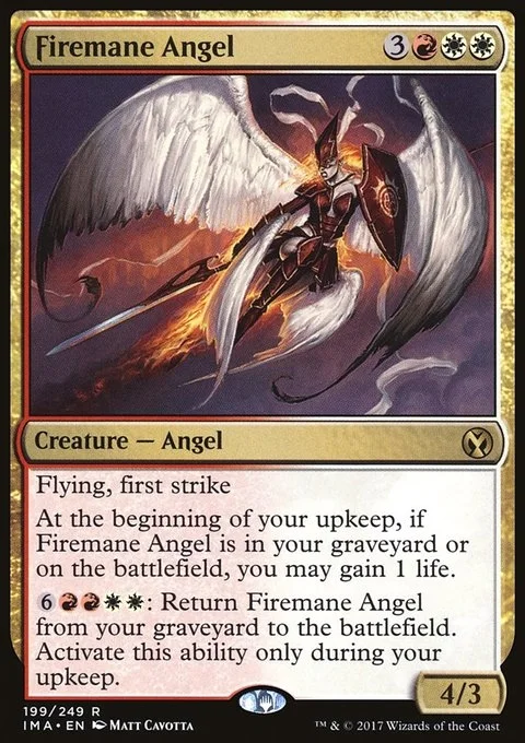 Flying, first strike At the beginning of your upkeep, if Firemane Angel is in your graveyard or on the battlefield, you may gain 1 life. {6}{R}{R}{W}{W}: Return Firemane Angel from your graveyard to the battlefield. Activate only during your upkeep.