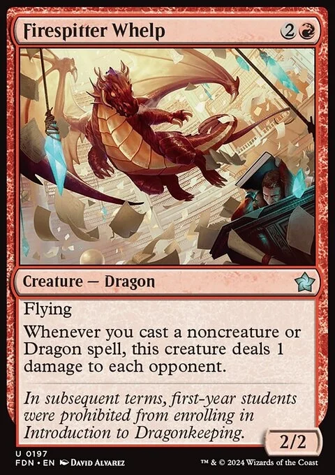 Flying Whenever you cast a noncreature or Dragon spell, Firespitter Whelp deals 1 damage to each opponent.