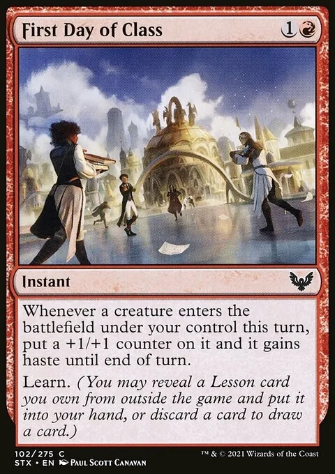 Whenever a creature you control enters this turn, put a +1/+1 counter on it and it gains haste until end of turn. Learn. (You may reveal a Lesson card you own from outside the game and put it into your hand, or discard a card to draw a card.)