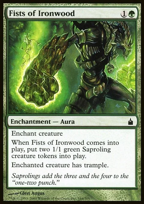 Enchant creature When Fists of Ironwood enters, create two 1/1 green Saproling creature tokens. Enchanted creature has trample.