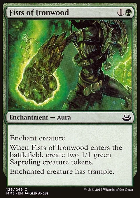 Enchant creature When this Aura enters, create two 1/1 green Saproling creature tokens. Enchanted creature has trample.