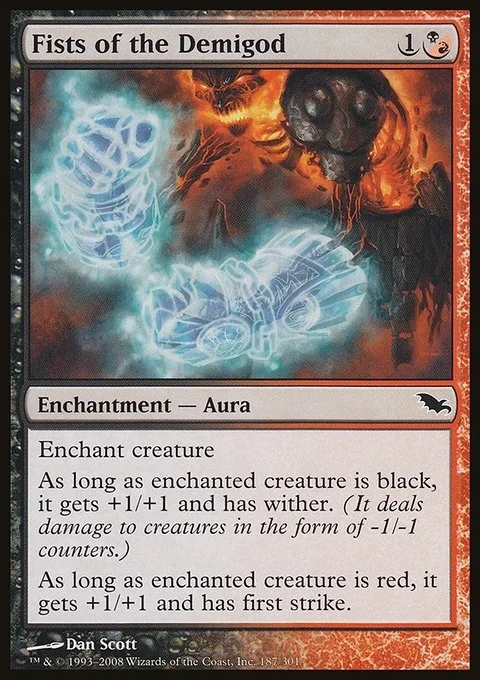 Enchant creature As long as enchanted creature is black, it gets +1/+1 and has wither. (It deals damage to creatures in the form of -1/-1 counters.) As long as enchanted creature is red, it gets +1/+1 and has first strike.