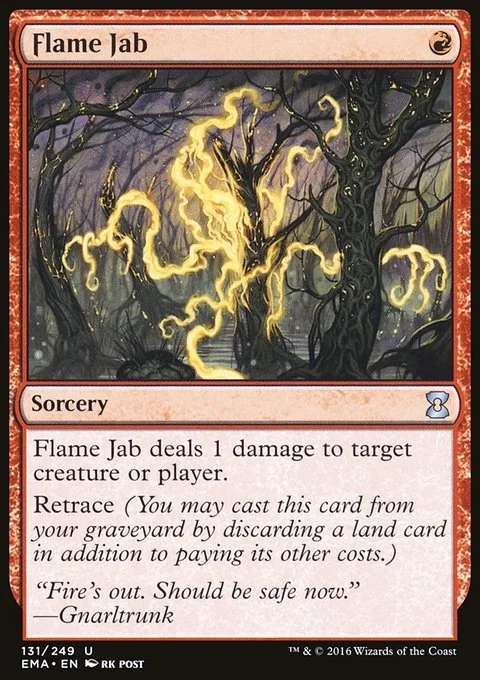 Flame Jab deals 1 damage to any target. Retrace (You may cast this card from your graveyard by discarding a land card in addition to paying its other costs.)