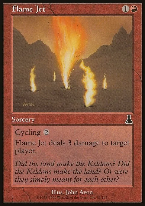 Flame Jet deals 3 damage to target player or planeswalker. Cycling {2} ({2}, Discard this card: Draw a card.)