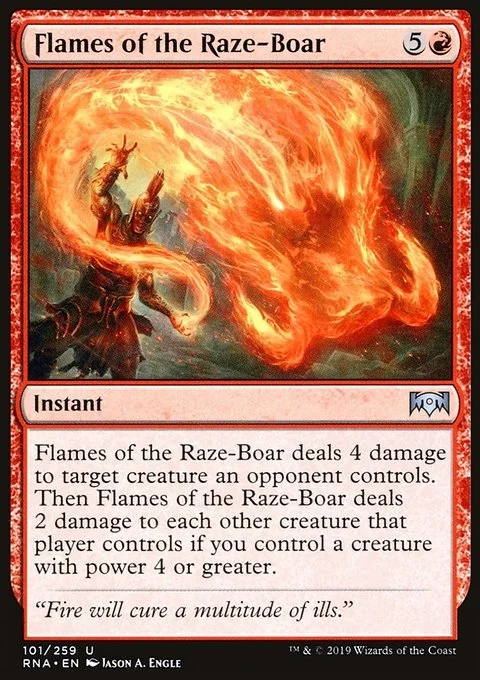 Flames of the Raze-Boar deals 4 damage to target creature an opponent controls. Then Flames of the Raze-Boar deals 2 damage to each other creature that player controls if you control a creature with power 4 or greater.