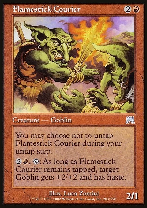 You may choose not to untap Flamestick Courier during your untap step. {2}{R}, {T}: Target Goblin creature gets +2/+2 and has haste for as long as Flamestick Courier remains tapped.