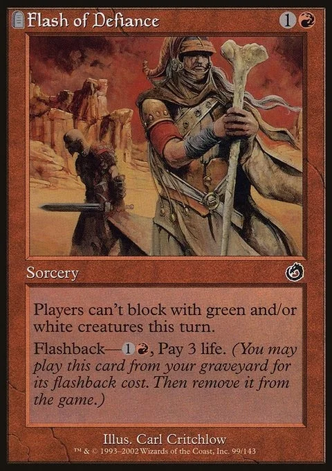 Green creatures and white creatures can't block this turn. Flashback—{1}{R}, Pay 3 life. (You may cast this card from your graveyard for its flashback cost. Then exile it.)