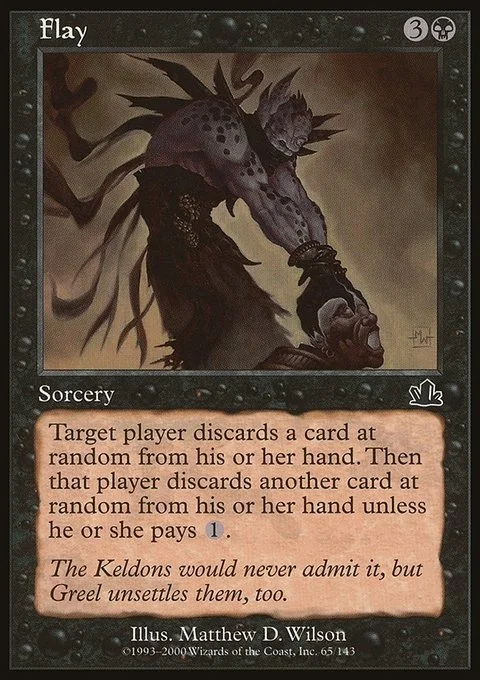 Target player discards a card at random. Then that player discards another card at random unless they pay {1}.