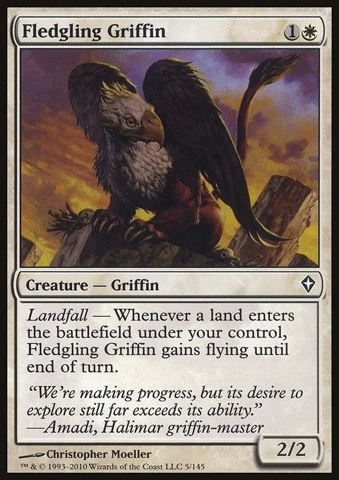 Landfall — Whenever a land enters the battlefield under your control, Fledgling Griffin gains flying until end of turn.