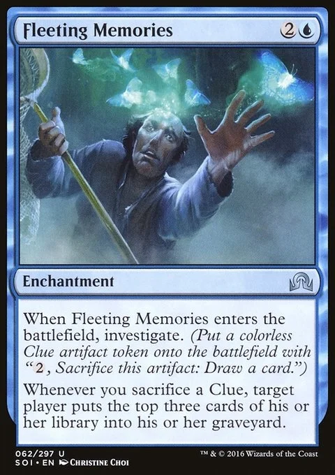 When Fleeting Memories enters the battlefield, investigate. (Create a Clue token. It's an artifact with "{2}, Sacrifice this artifact: Draw a card.") Whenever you sacrifice a Clue, target player mills three cards.