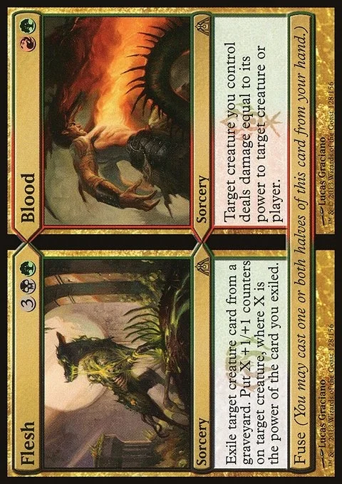 Flesh Exile target creature card from a graveyard. Put X +1/+1 counters on target creature, where X is the power of the card you exiled. Fuse (You may cast one or both halves of this card from your hand.) Blood Target creature you control deals damage equal to its power to any target. Fuse (You may cast one or both halves of this card from your hand.)
