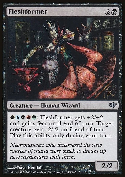 {W}{U}{B}{R}{G}: Fleshformer gets +2/+2 and gains fear until end of turn. Target creature gets -2/-2 until end of turn. Activate only during your turn. (A creature with fear can't be blocked except by artifact creatures and/or black creatures.)