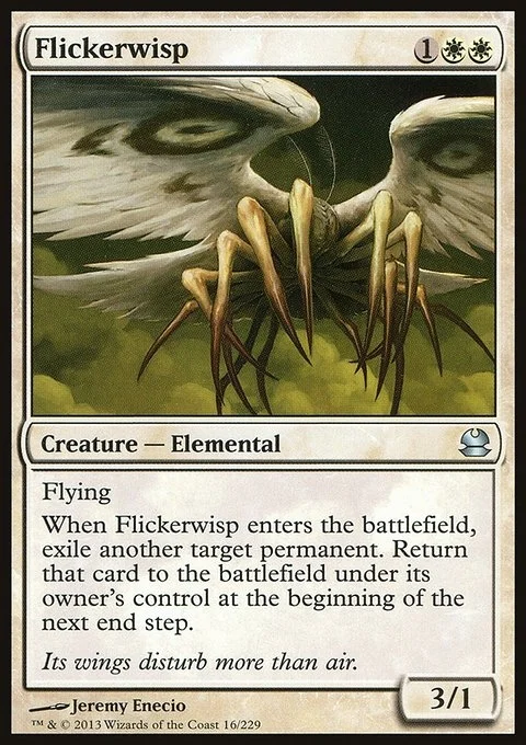 Flying When Flickerwisp enters the battlefield, exile another target permanent. Return that card to the battlefield under its owner's control at the beginning of the next end step.