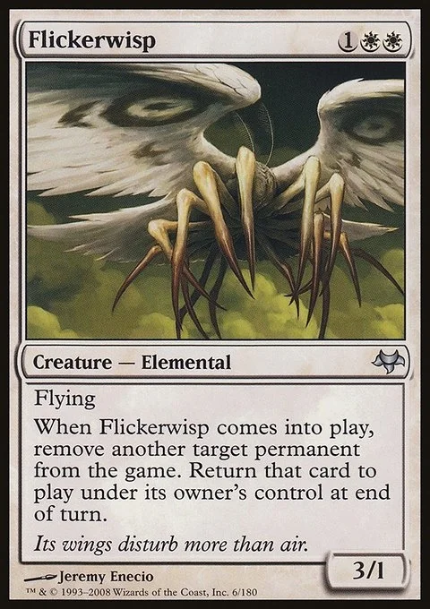 Flying When Flickerwisp enters the battlefield, exile another target permanent. Return that card to the battlefield under its owner's control at the beginning of the next end step.
