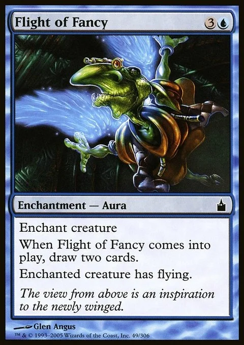 Enchant creature When Flight of Fancy enters, draw two cards. Enchanted creature has flying.