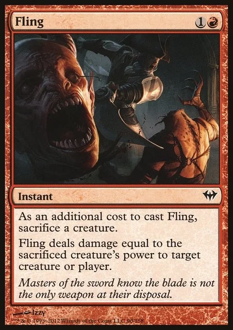 As an additional cost to cast this spell, sacrifice a creature. Fling deals damage equal to the sacrificed creature's power to any target.