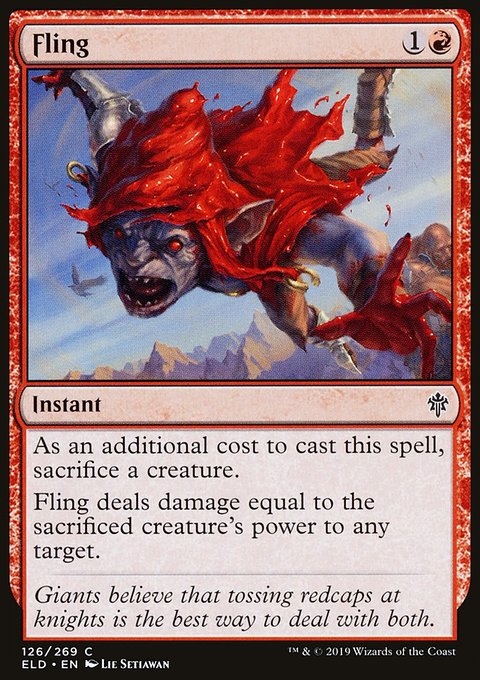 As an additional cost to cast this spell, sacrifice a creature. Fling deals damage equal to the sacrificed creature's power to any target.
