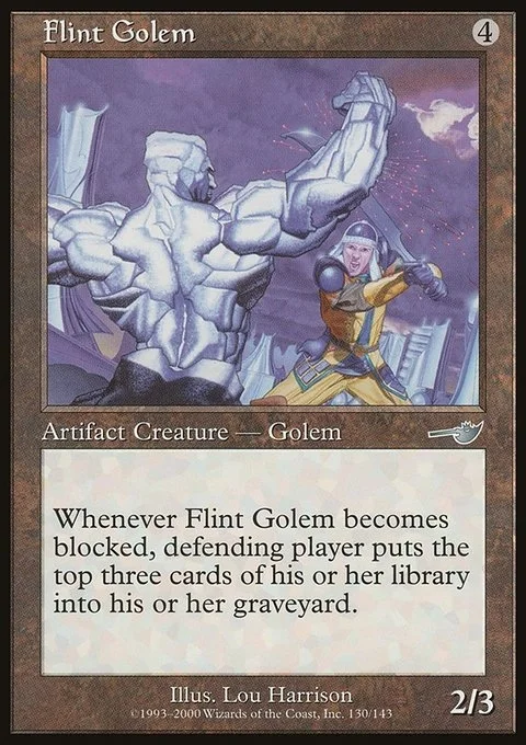 Whenever Flint Golem becomes blocked, defending player mills three cards.